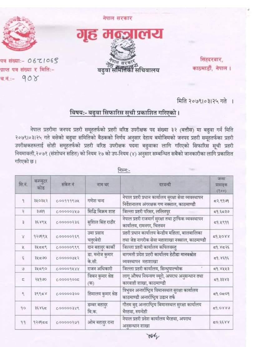 बढुवा सिफारिसको पहिलो नम्बरमा प्रहरी प्रधान कार्यालय सुरक्षा सेवा व्यवस्थापन निर्देशनालय अंगरक्षण गण नक्सालका एसपी गणेश चन्द रहेका छन् ।